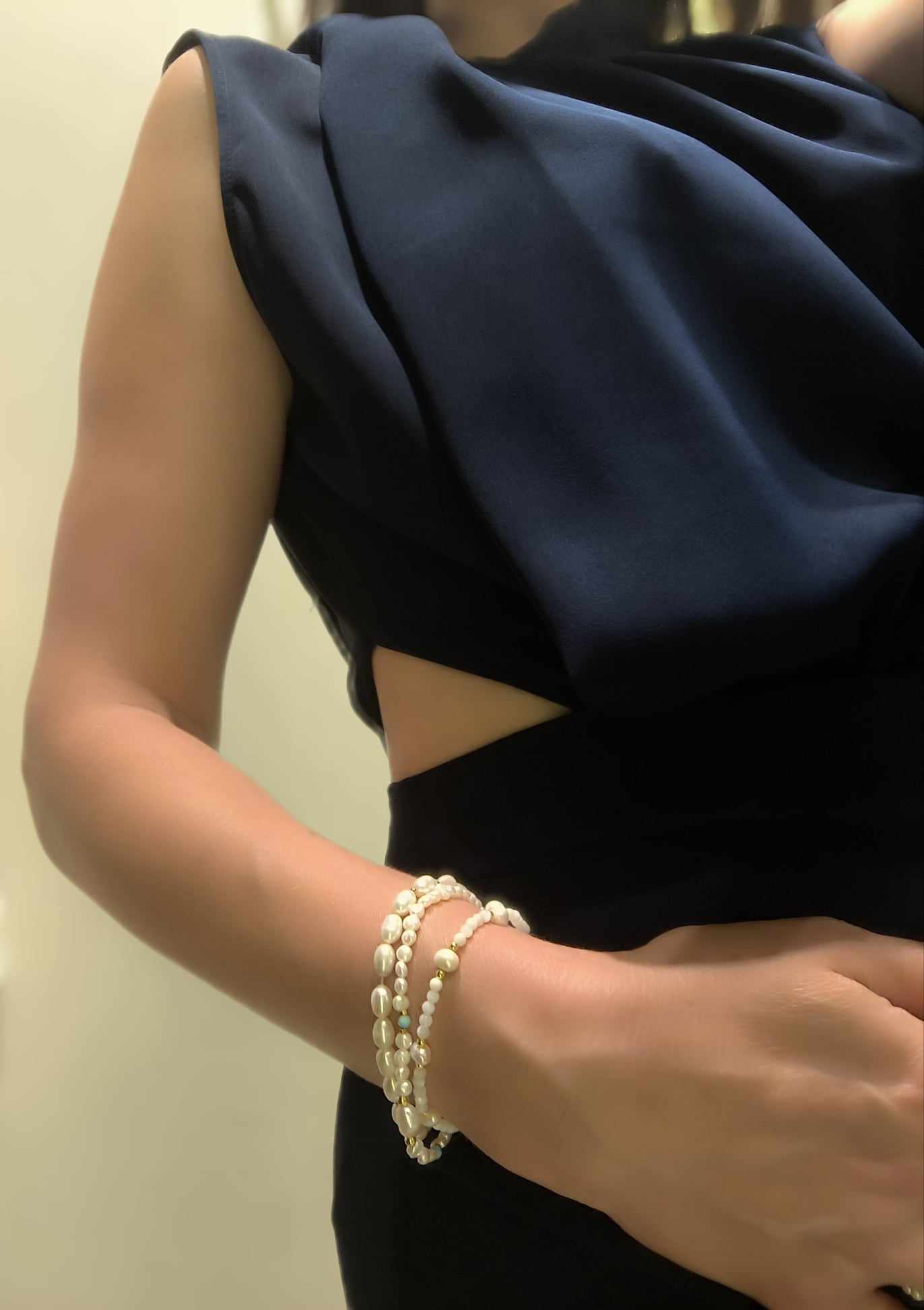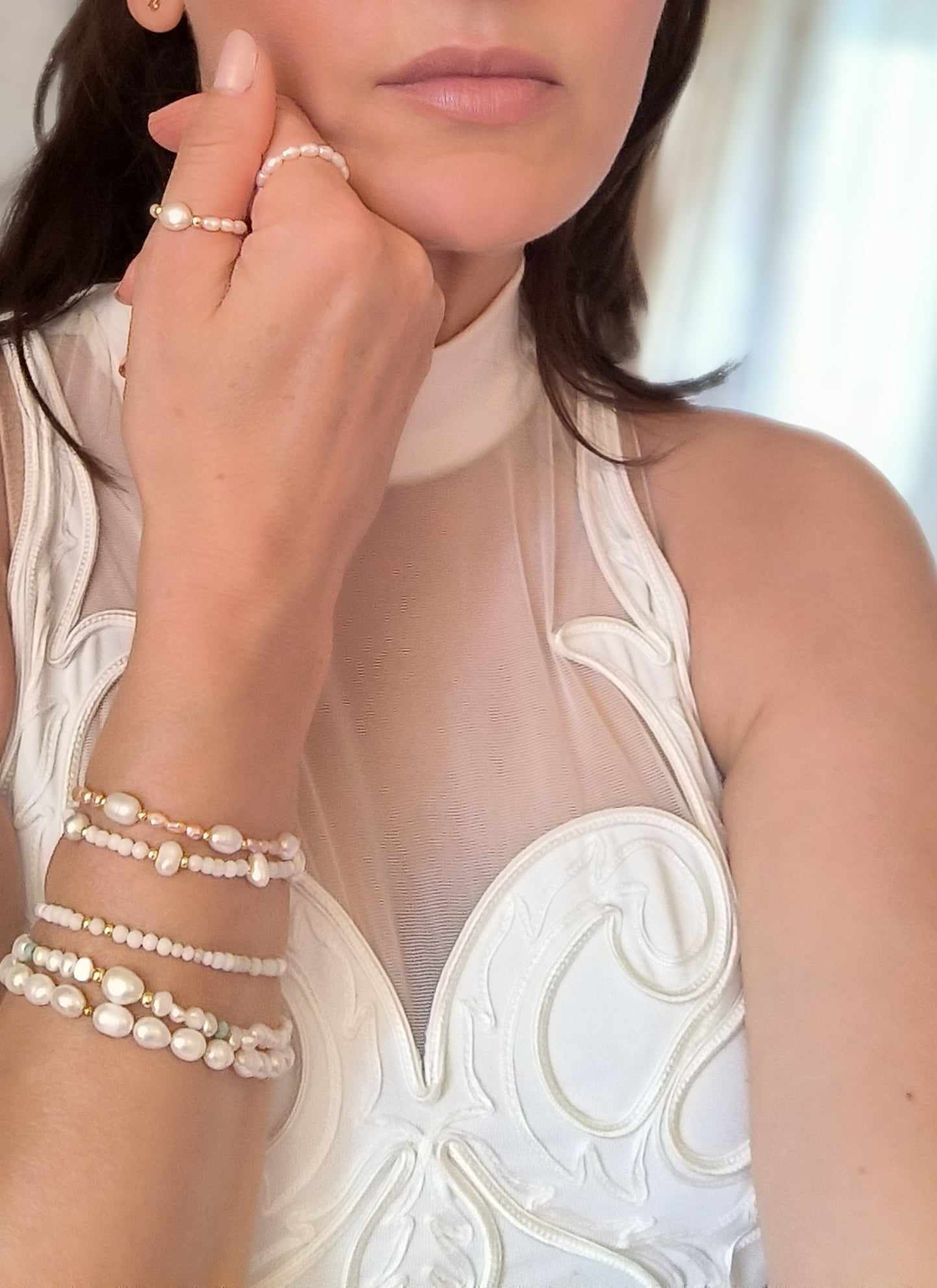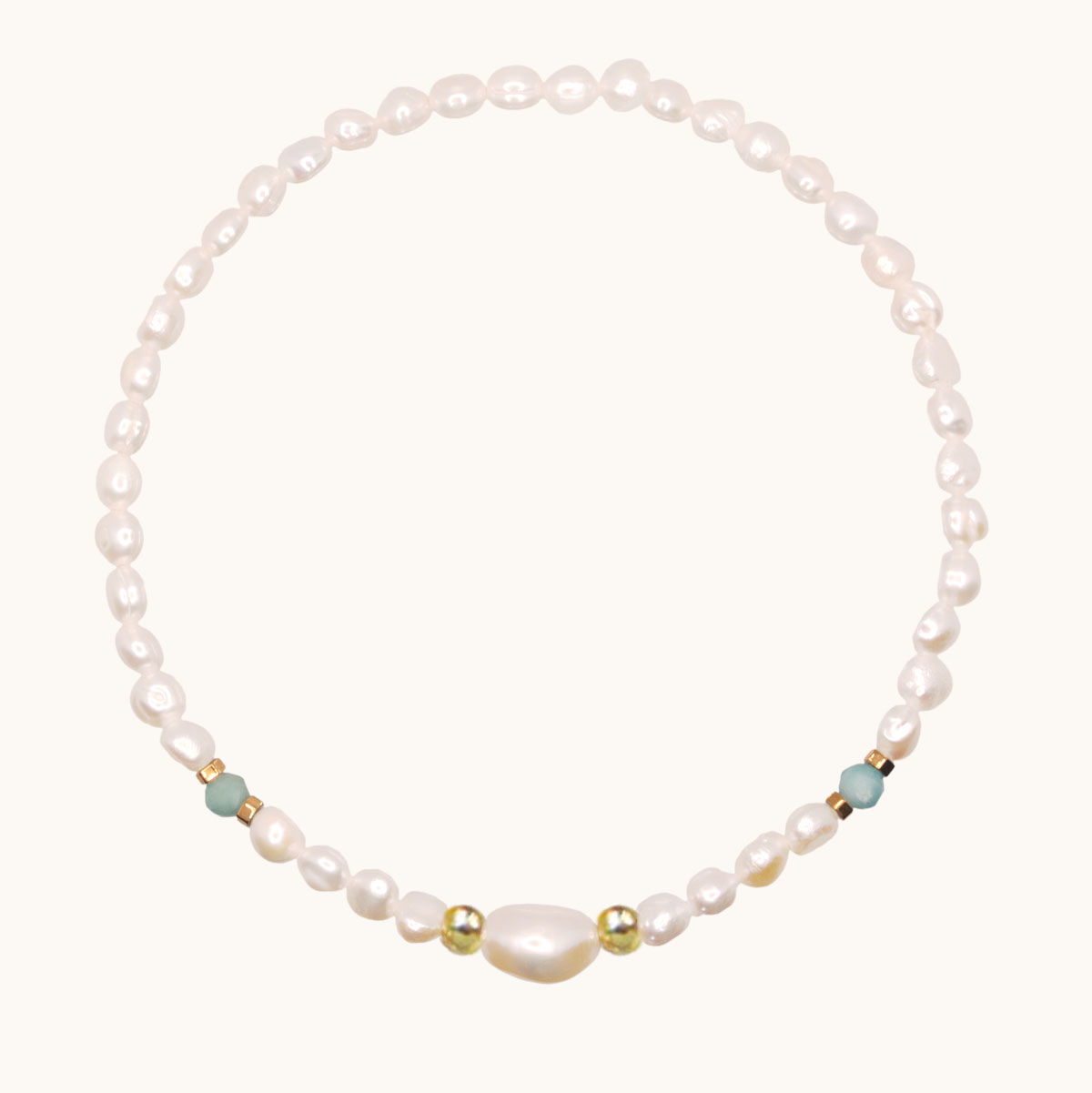 BDE106 Bransoletka elastyczna z pereł, amazonitów oraz srebra pozłacanego 24K