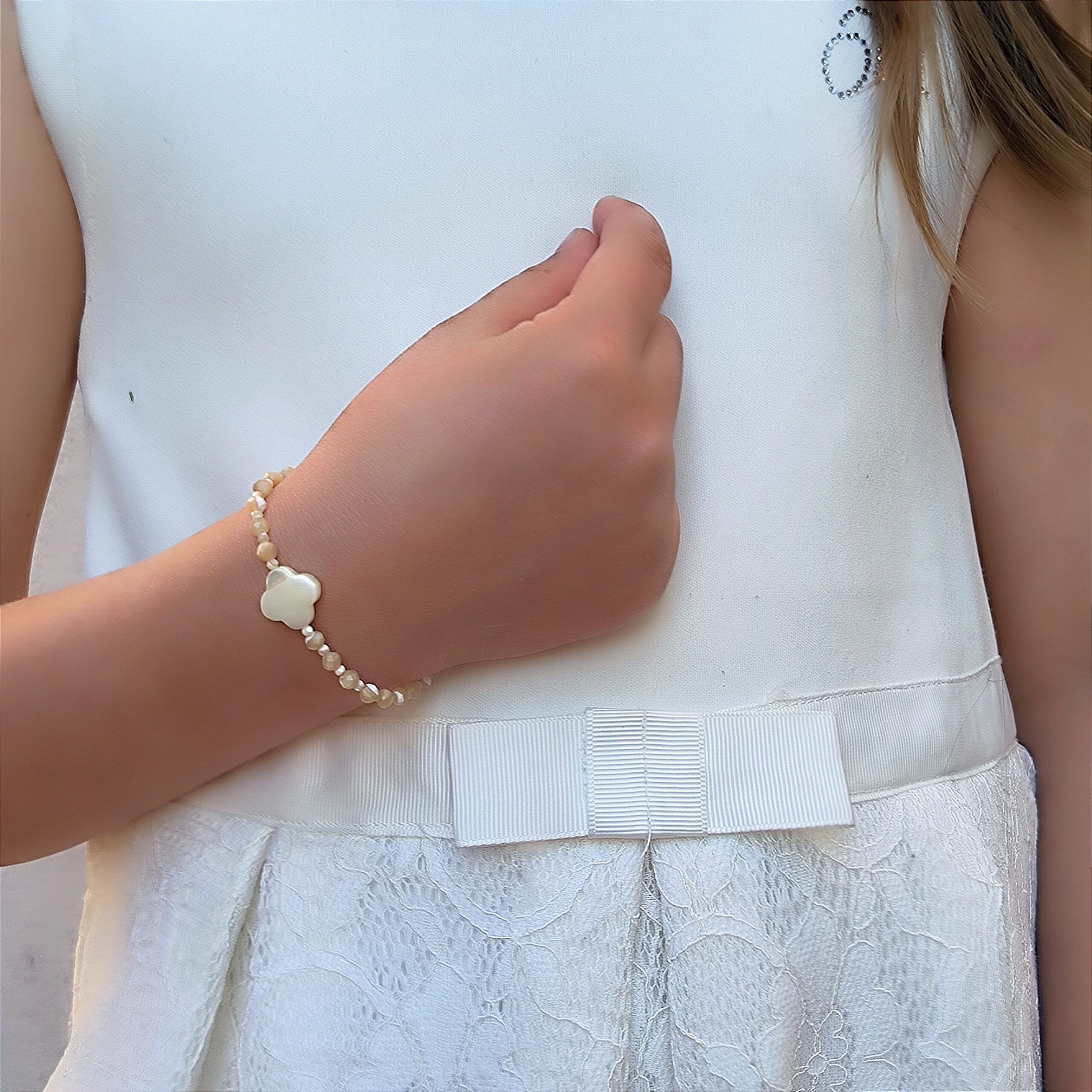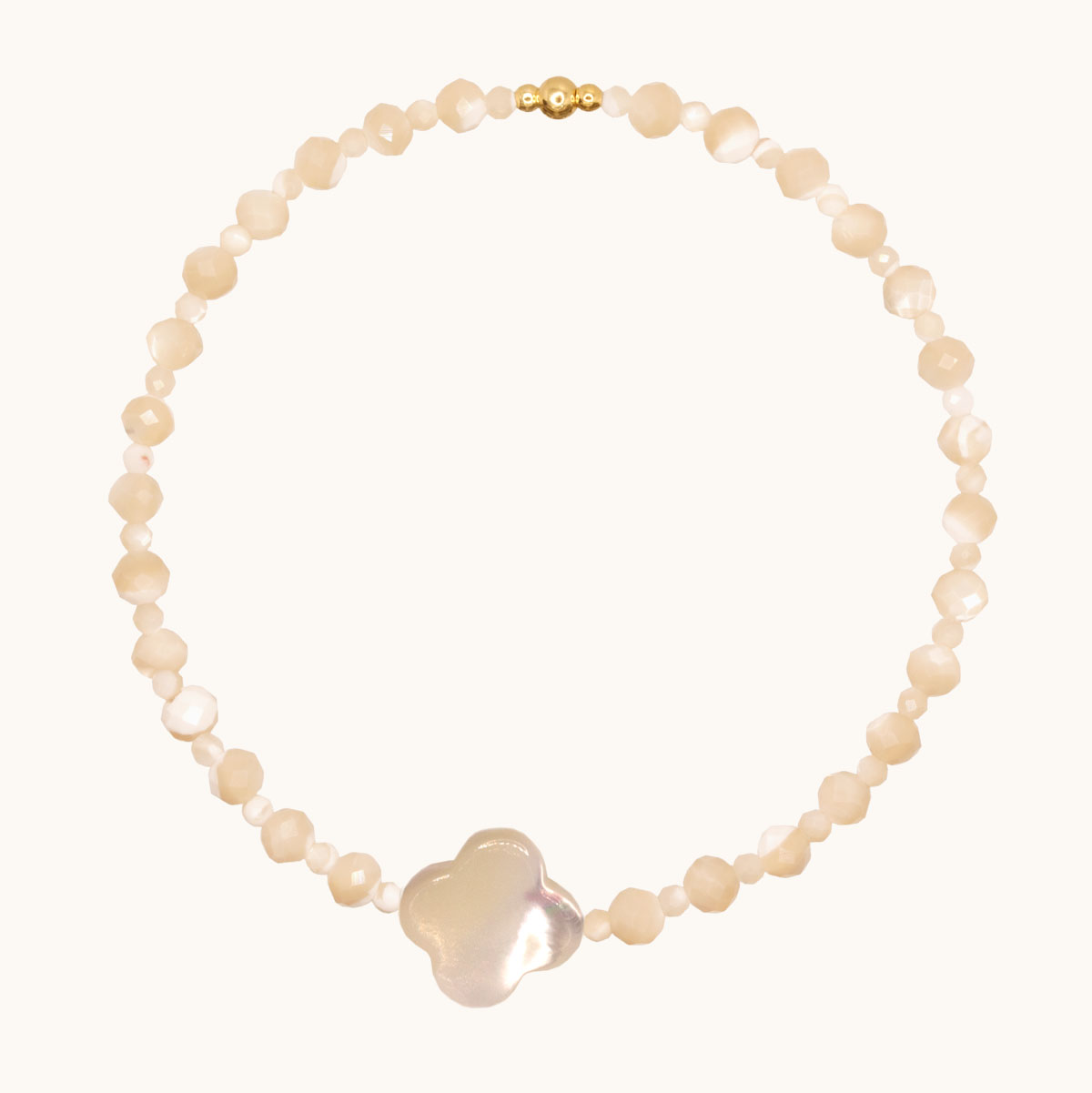 BDE107 Bransoletka elastyczna z masy perłowej z koniczyną i srebrem pozłacanym 24K