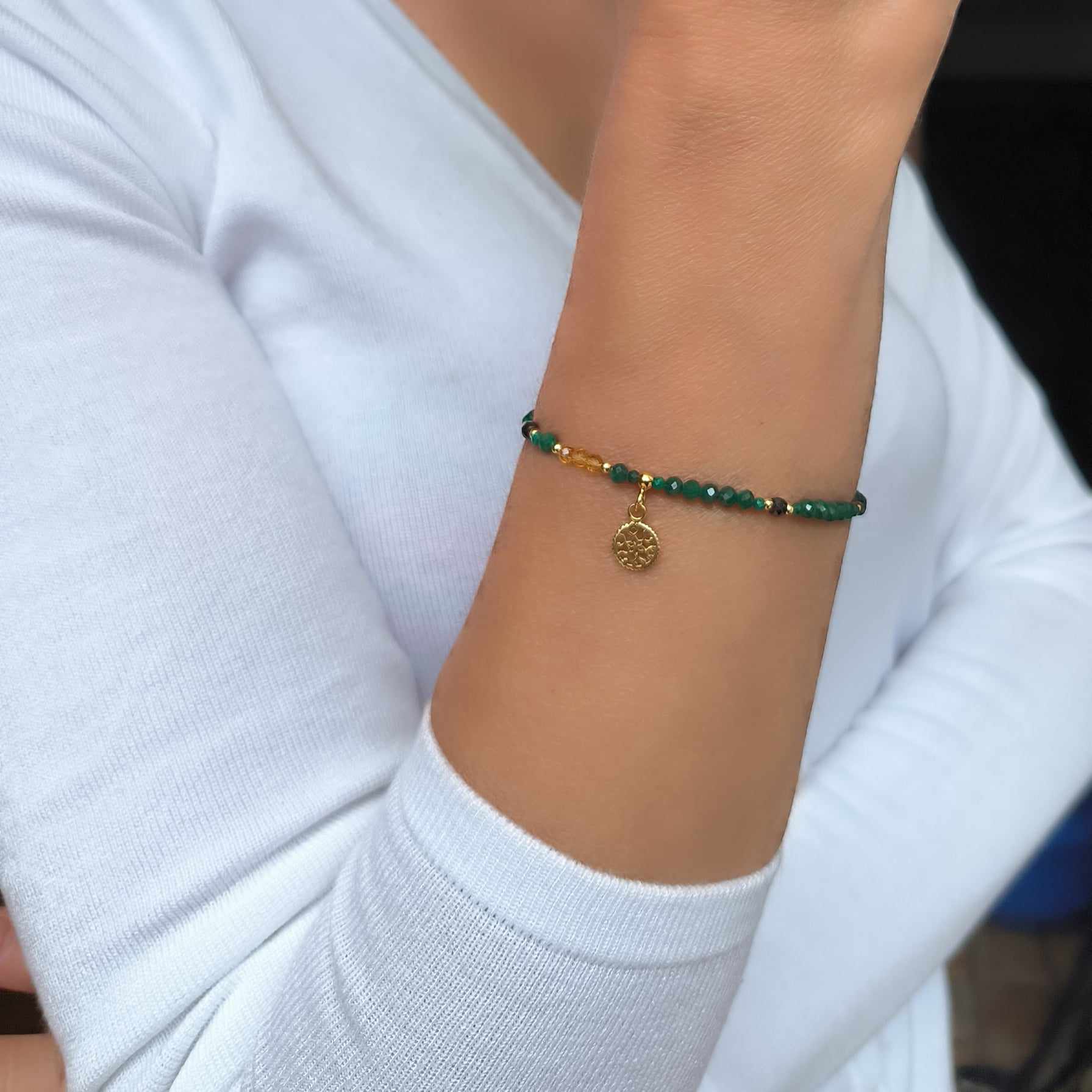 BDE119 Bransoletka elastyczna z malachitów, spieneli, cyrkonii oraz srebra pozłacanego 24K