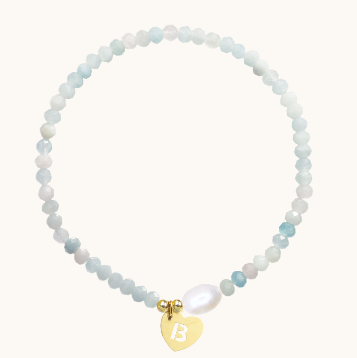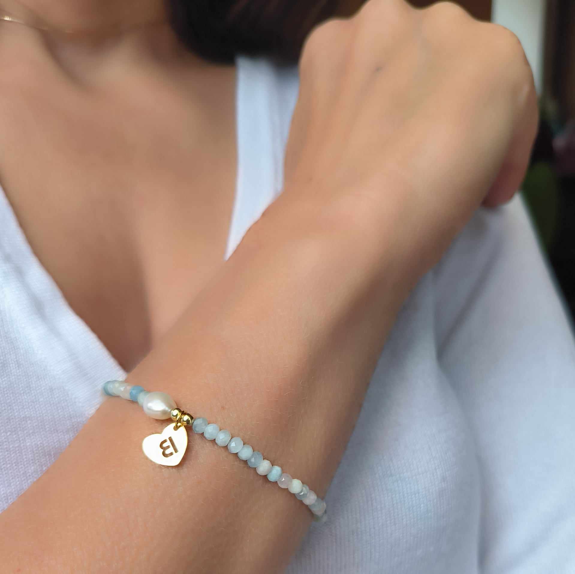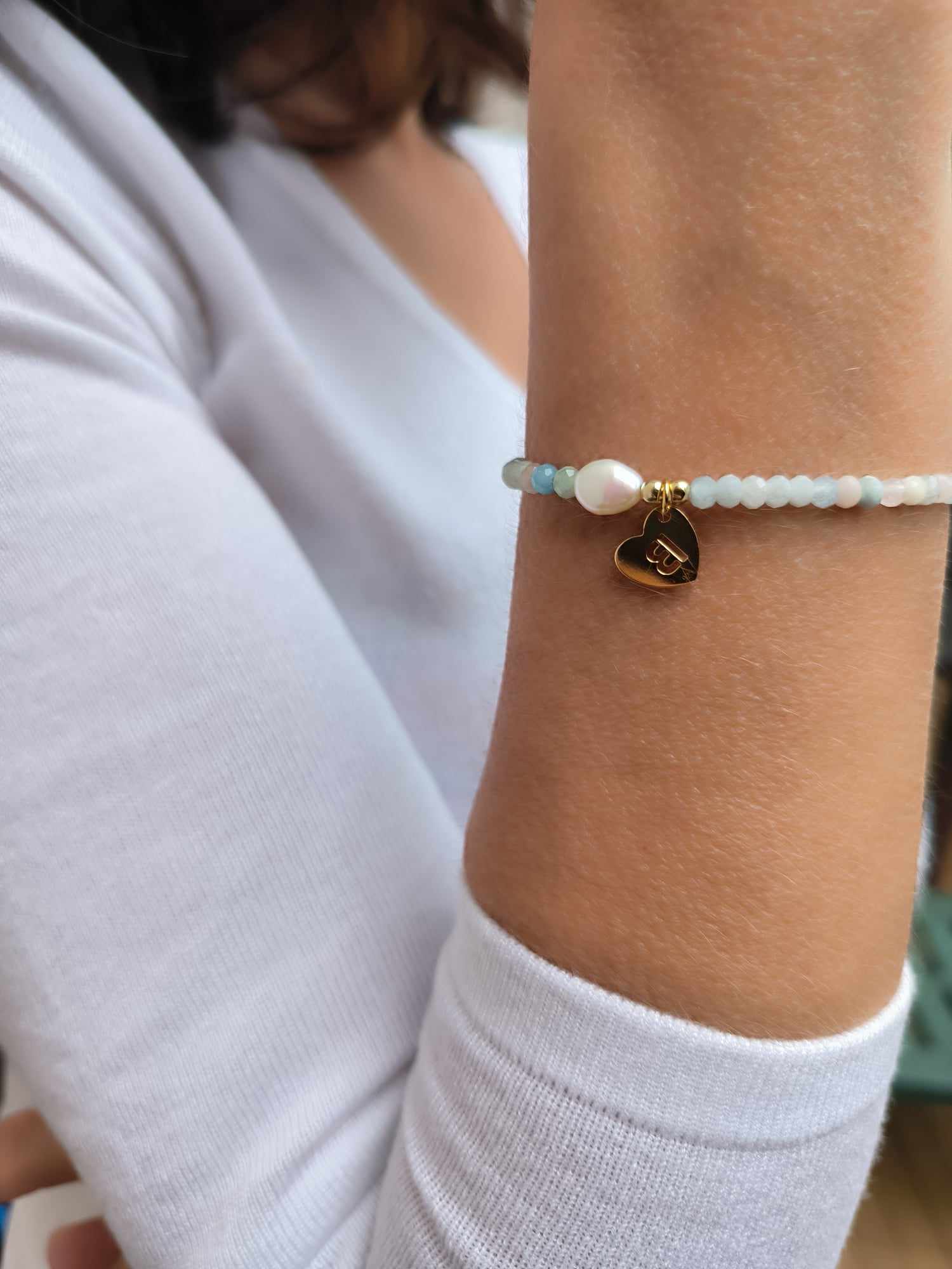 BDE122 Bransoletka z morganitów z perłą oraz literką ze srebra pozłoconego 24K