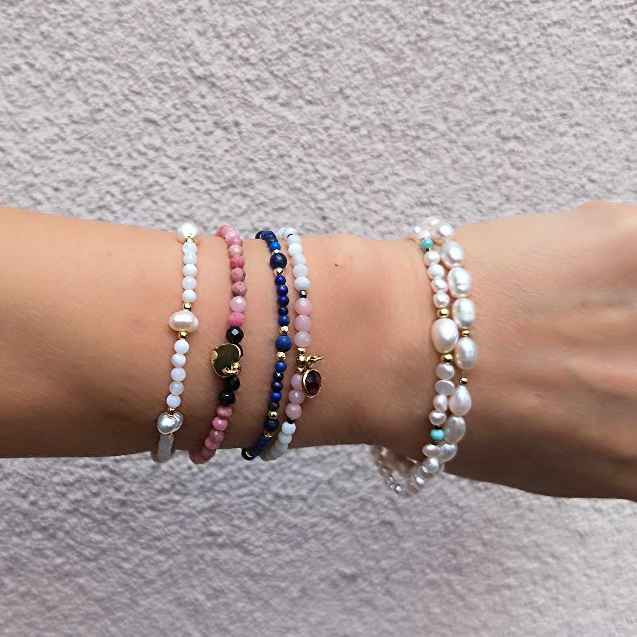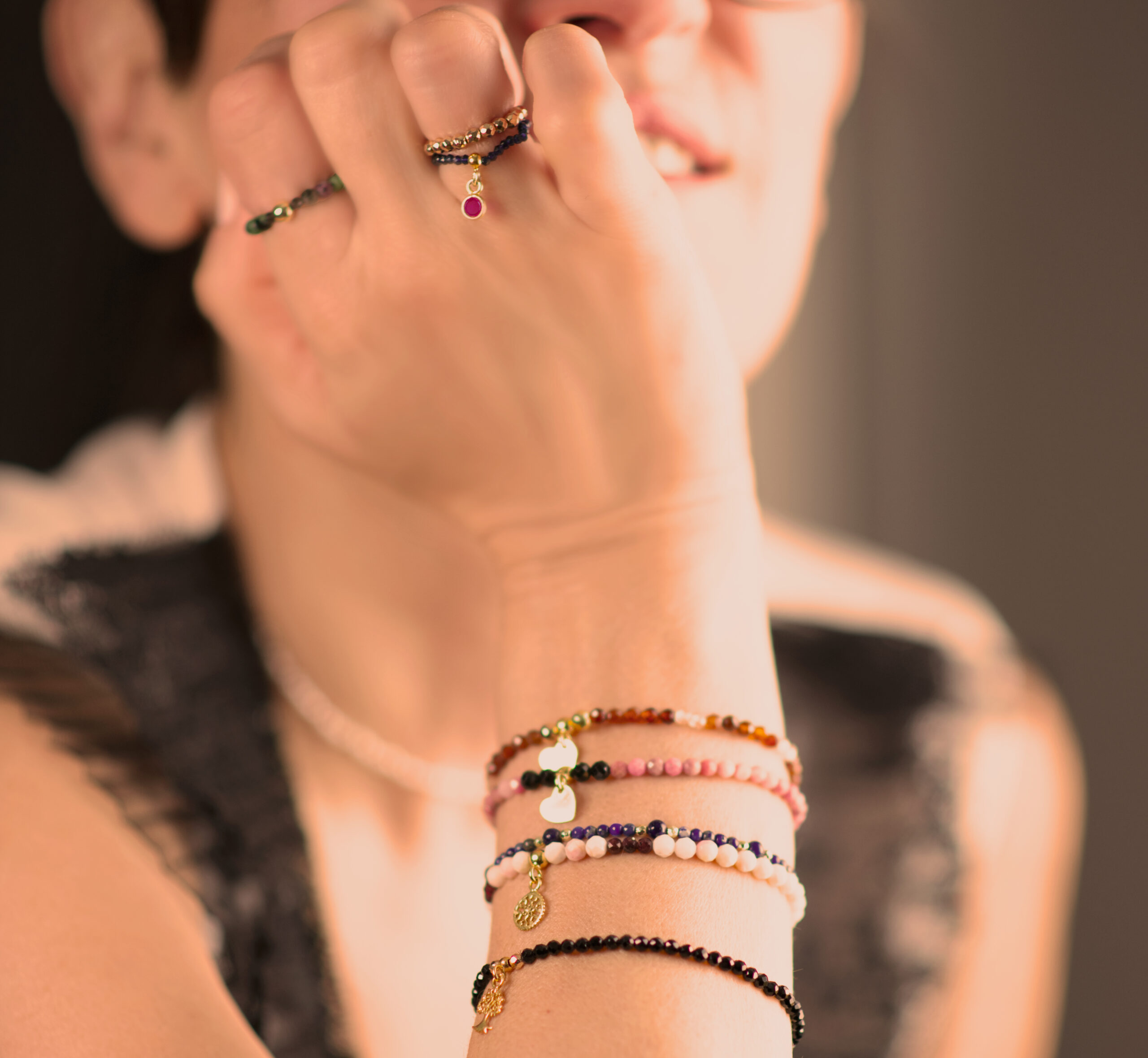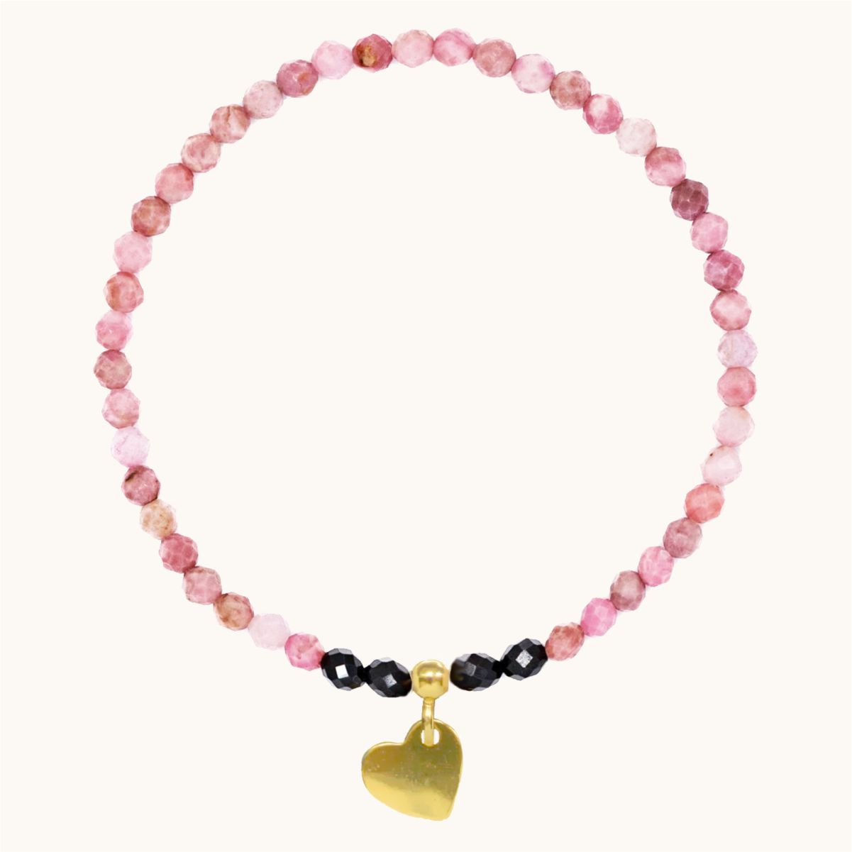 BDE59 Bransoletka elastyczna z rodonitów i spineli oraz srebra pozłacanego 24K