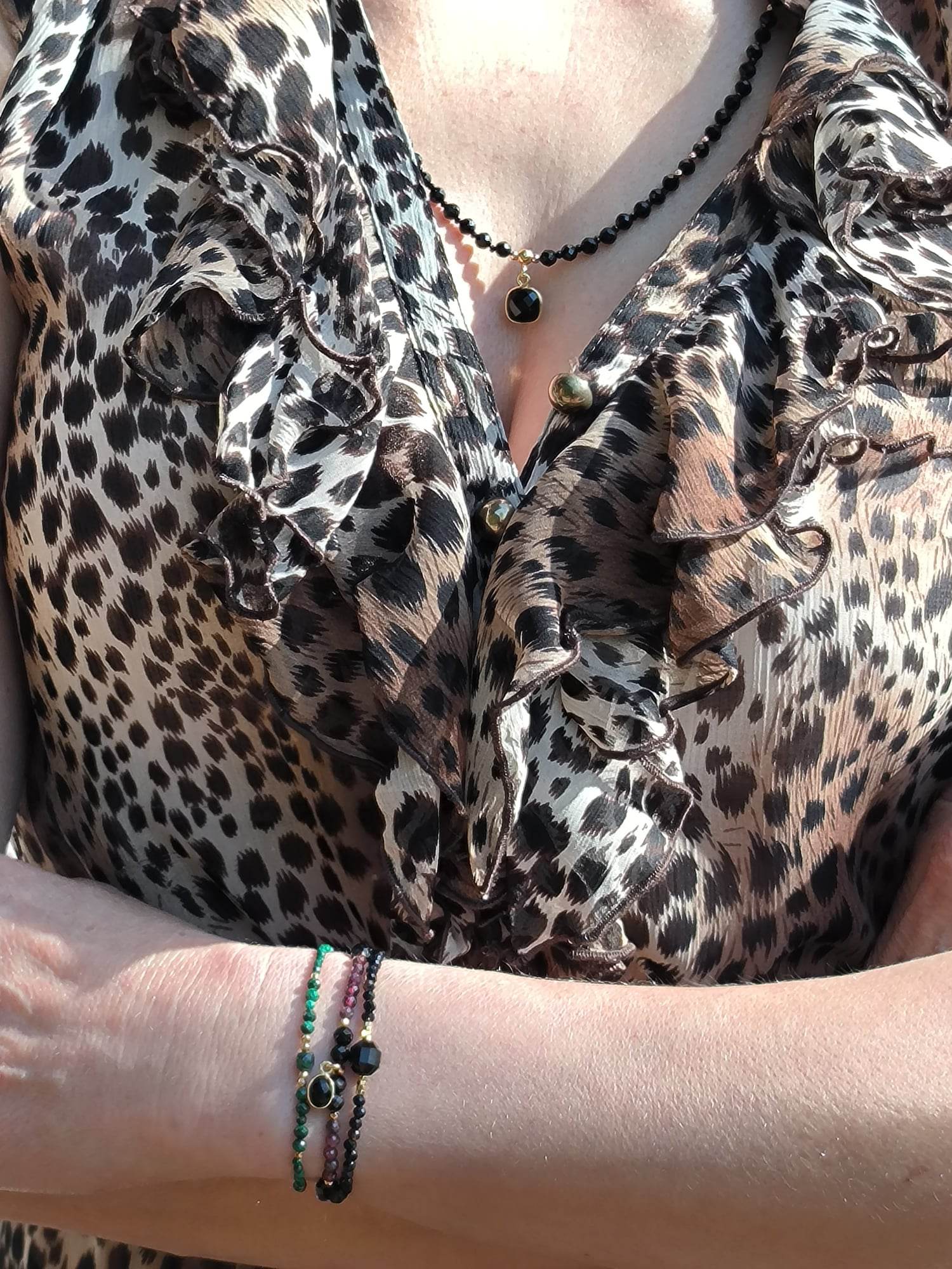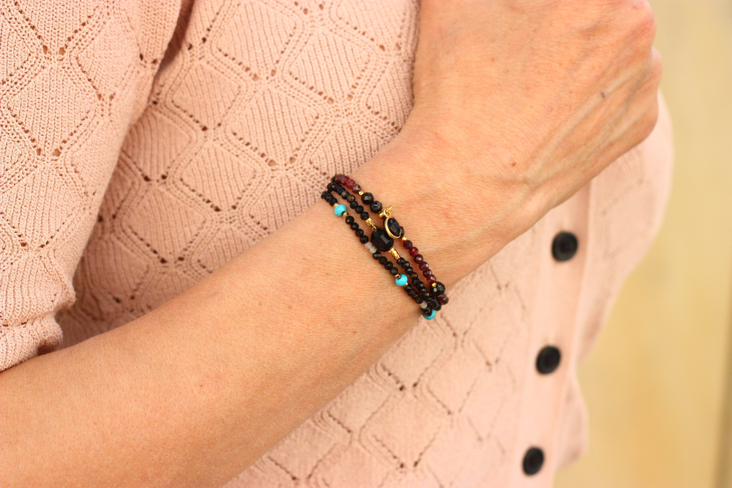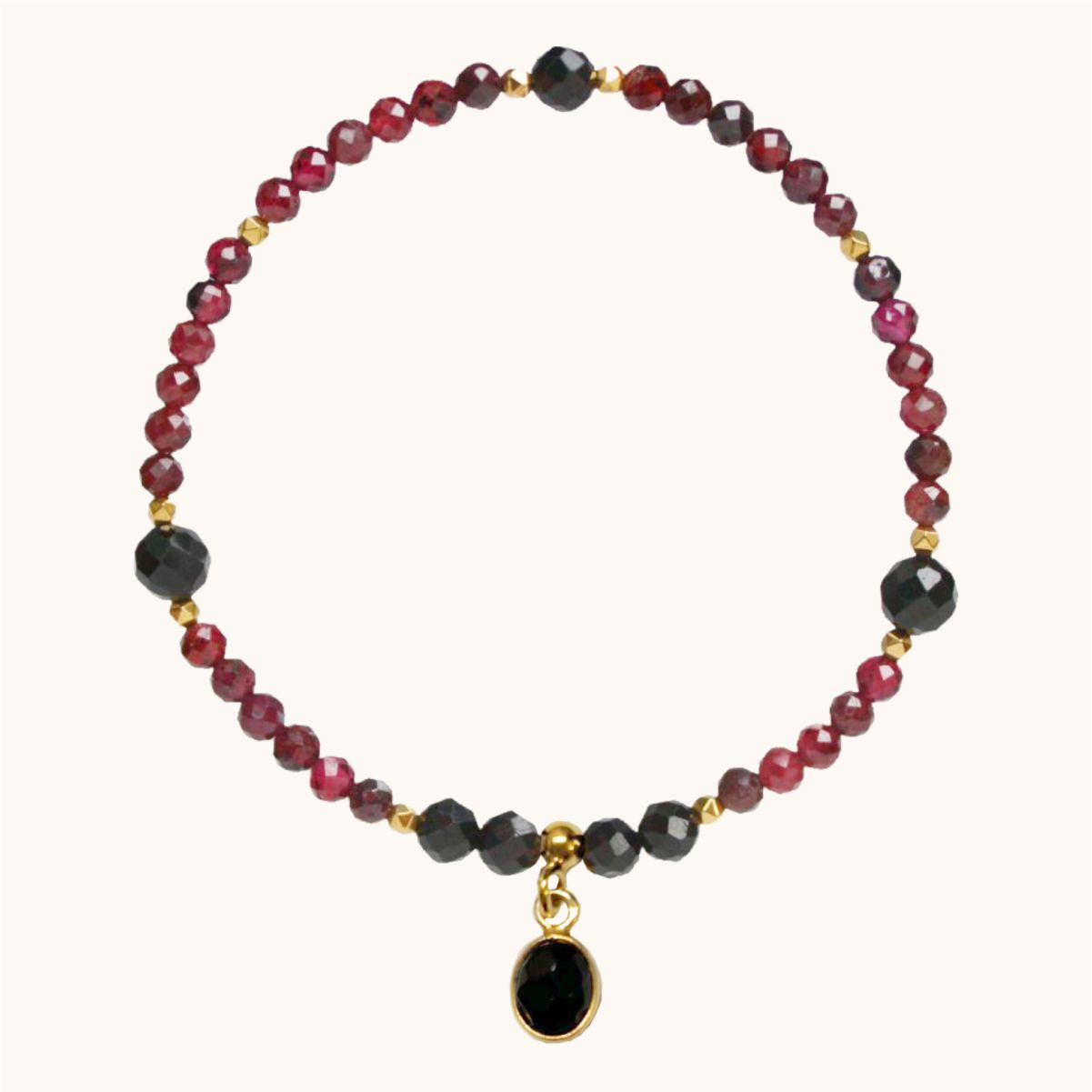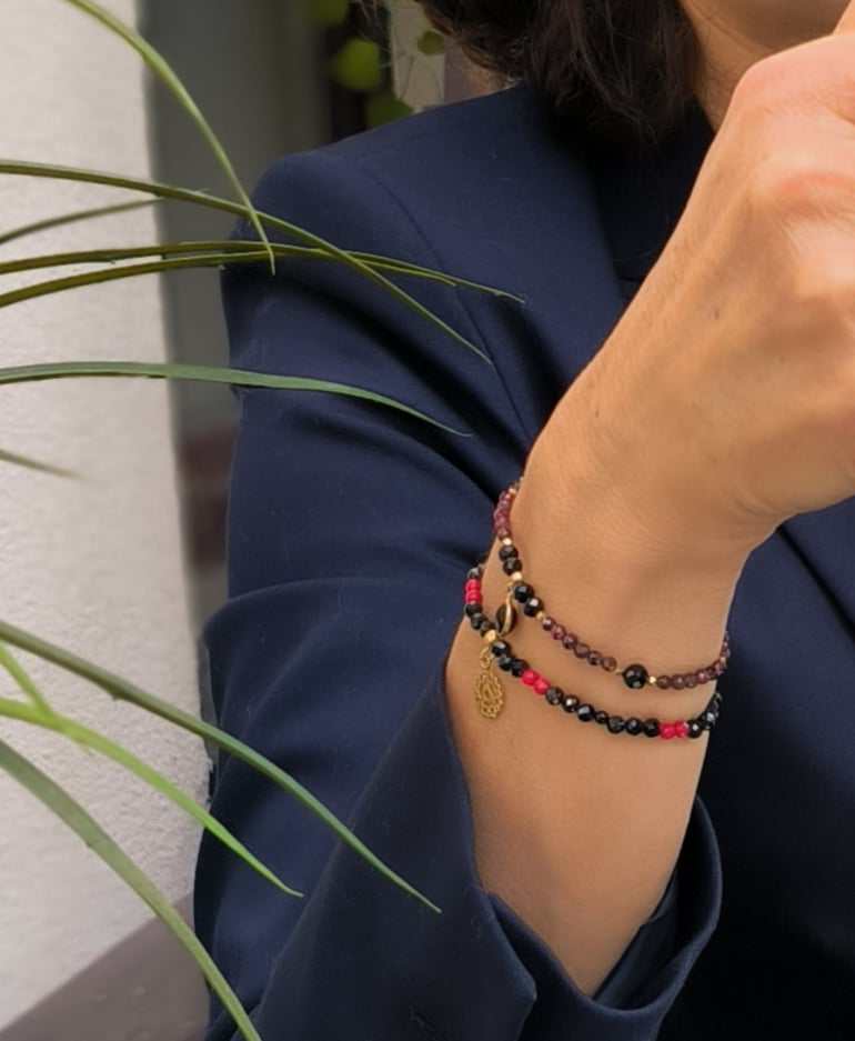 BDE88 Bransoletka elastyczna z granatów, turmalinów oraz zawieszki z onyksem