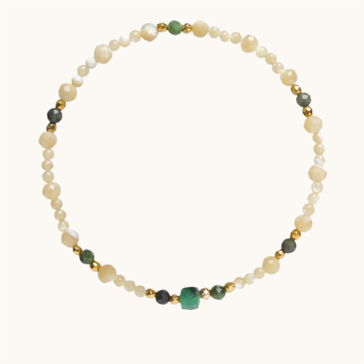 BDE92 Bransoletka elastyczna ze szmaragdów, masy perłowej oraz srebra z 24K złotem