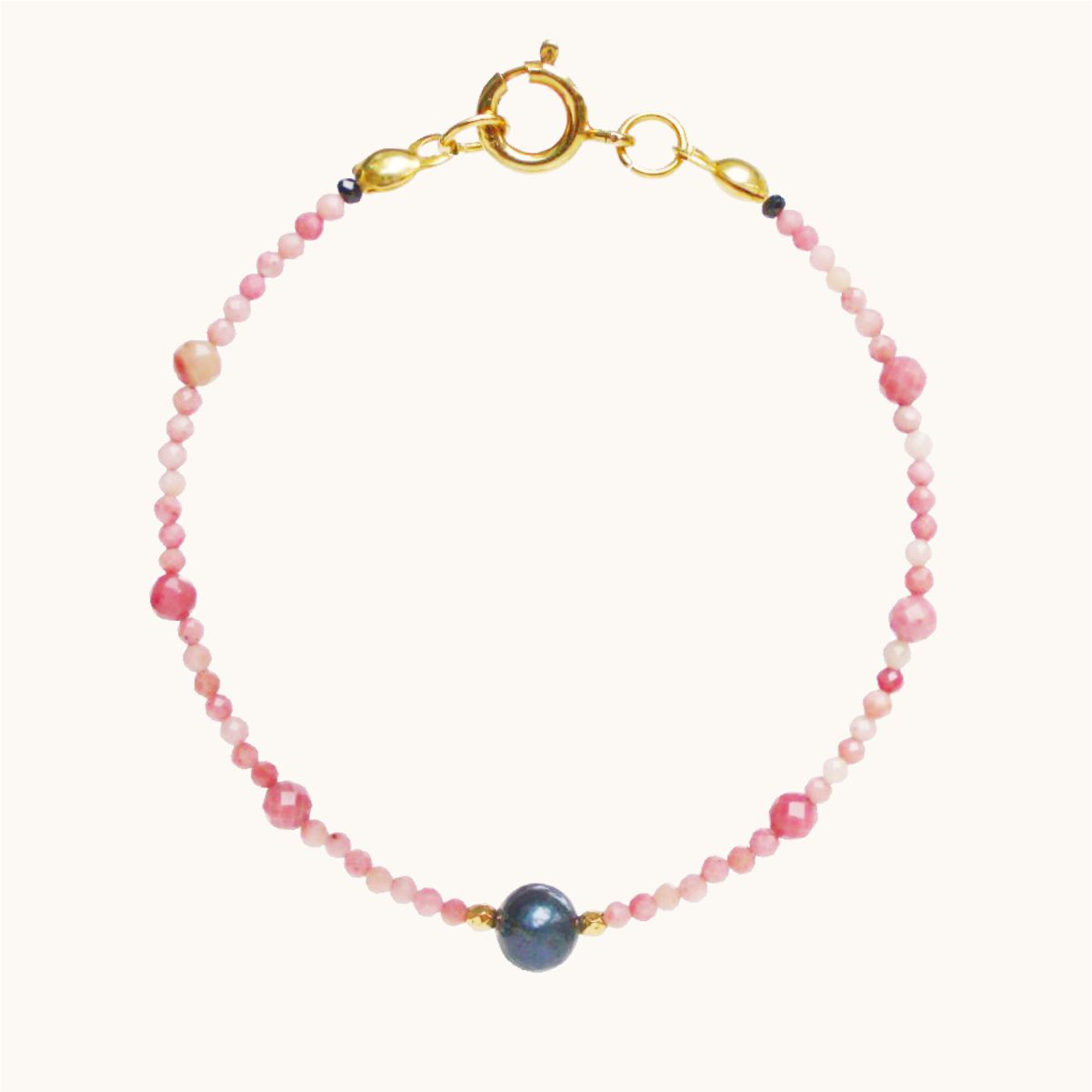 BDZ45 Bransoletka z rodonitów, spineli i perły oraz srebra pozłacanego 24K