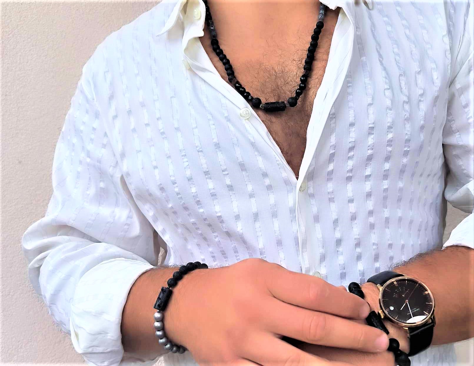 BME36 Bransoletka elastyczna z lawy wulkanicznej i hematytów