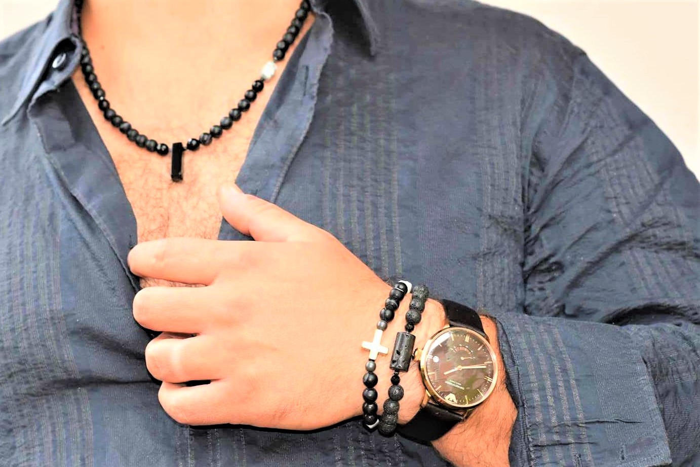 - hematyty (kol.grafitowy) ok.6mm oraz krzyż złoty ok. 20mm