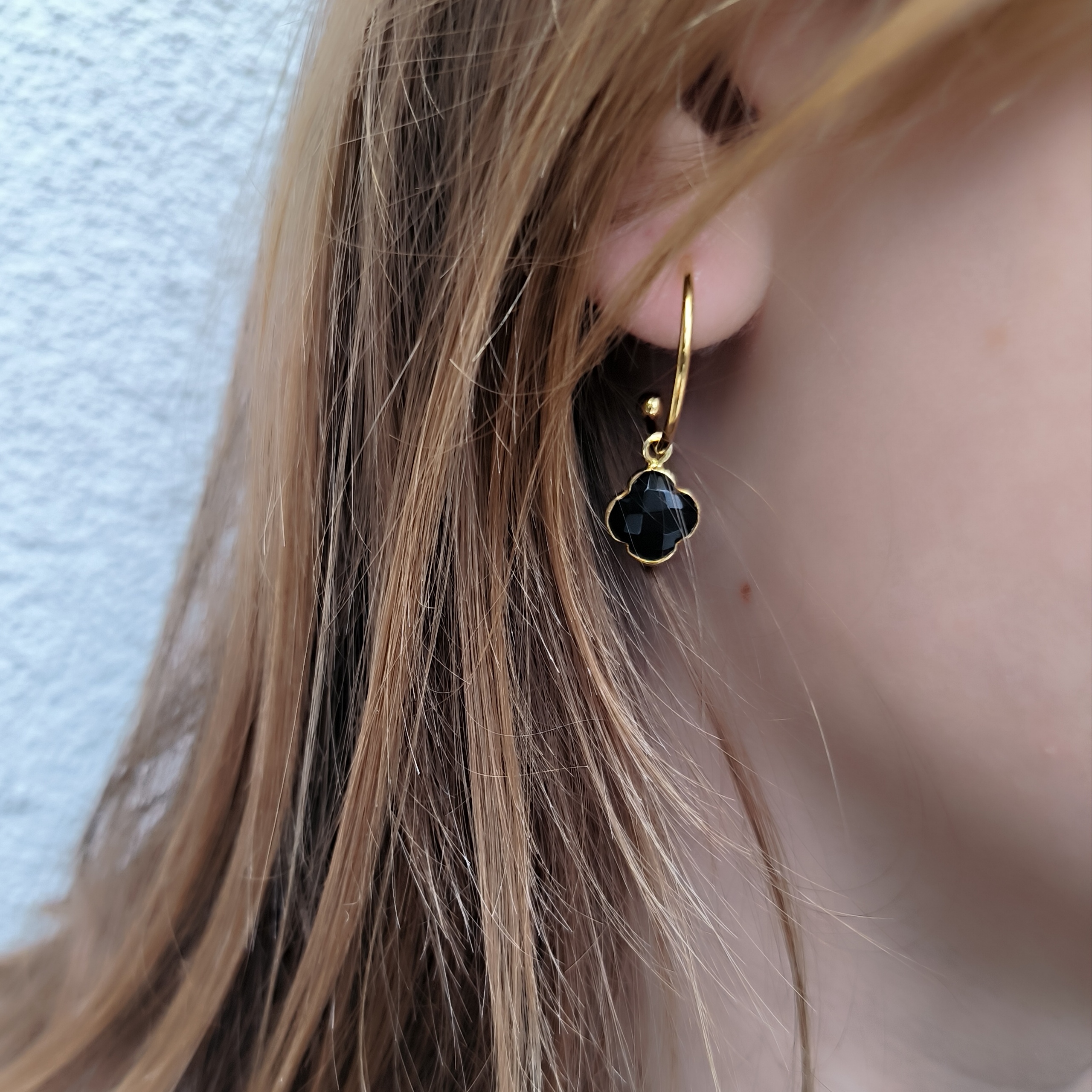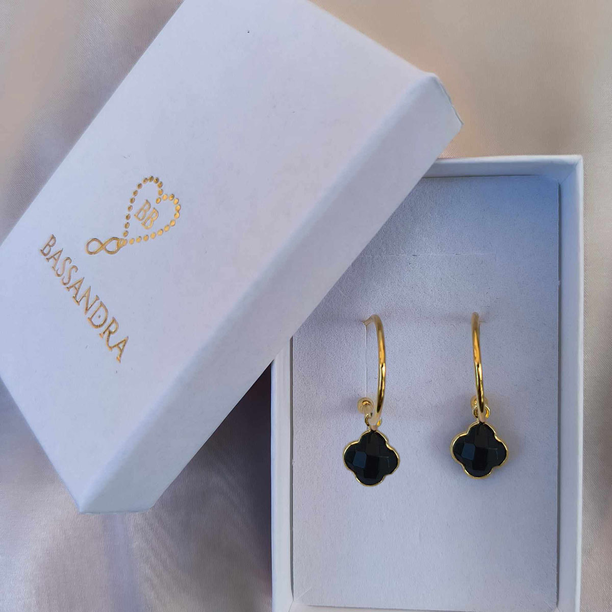 K46 Kolczyki z koniczynką z onyksu oraz ze srebra pozłoconego 24K