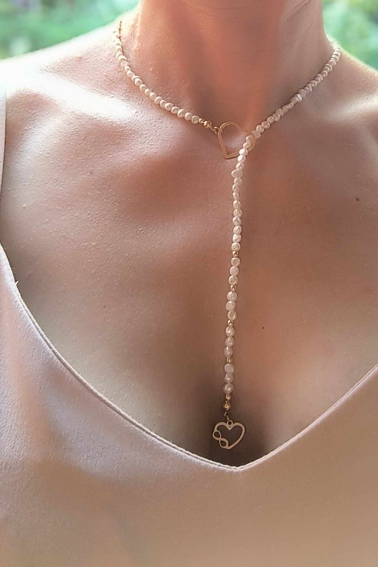 N74 Naszyjnik z pereł z sercami oraz srebrem pozłacanym 24K