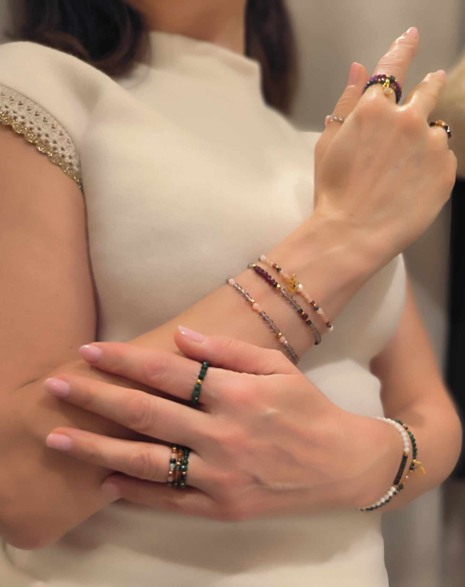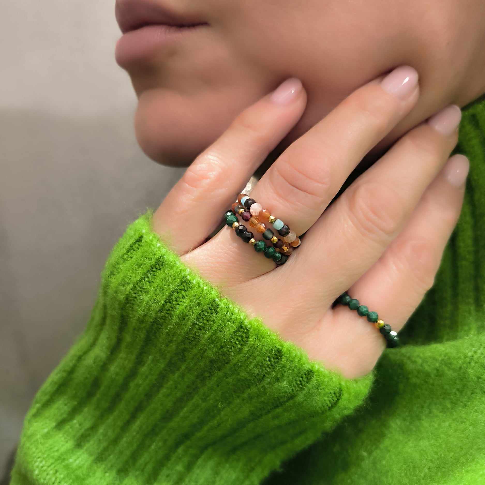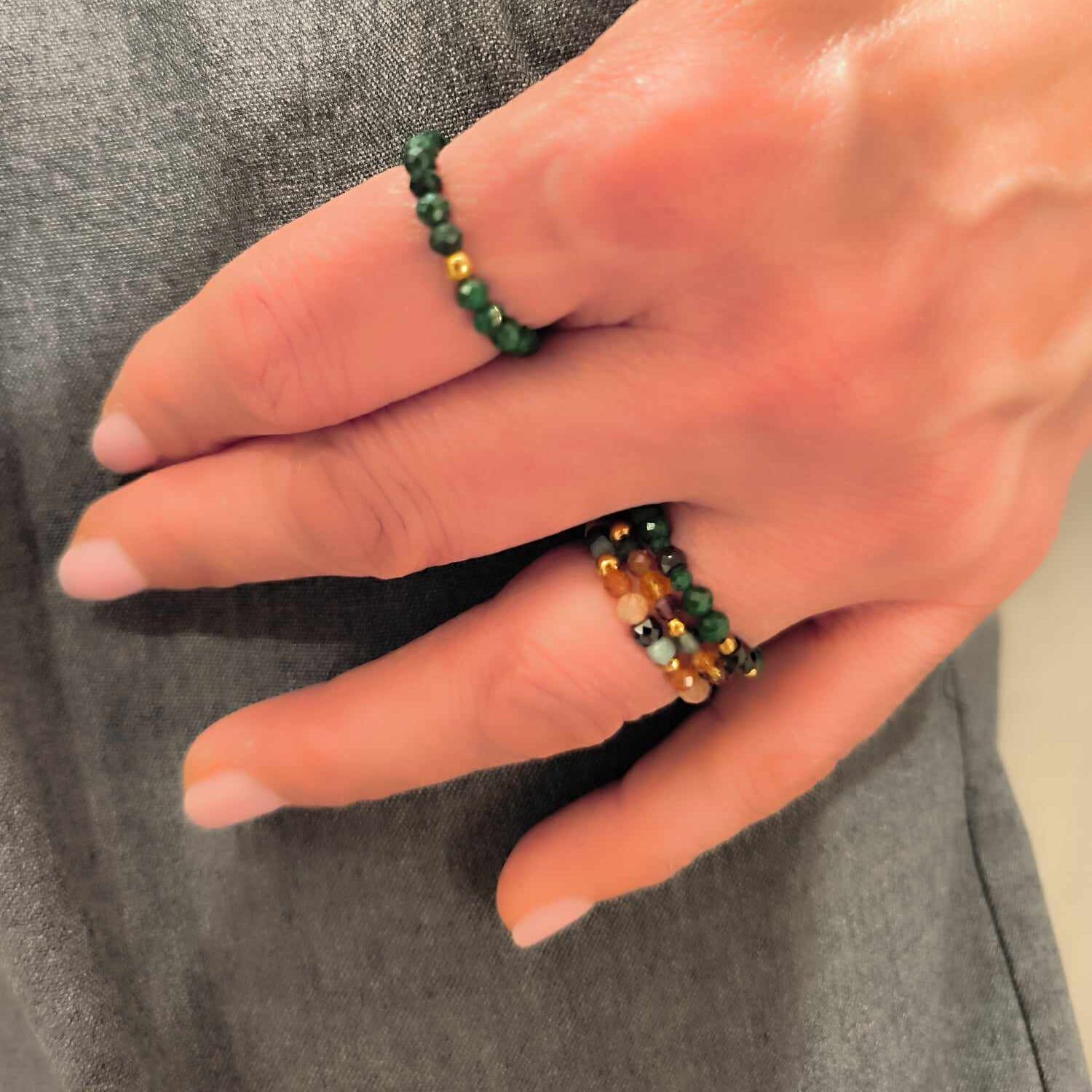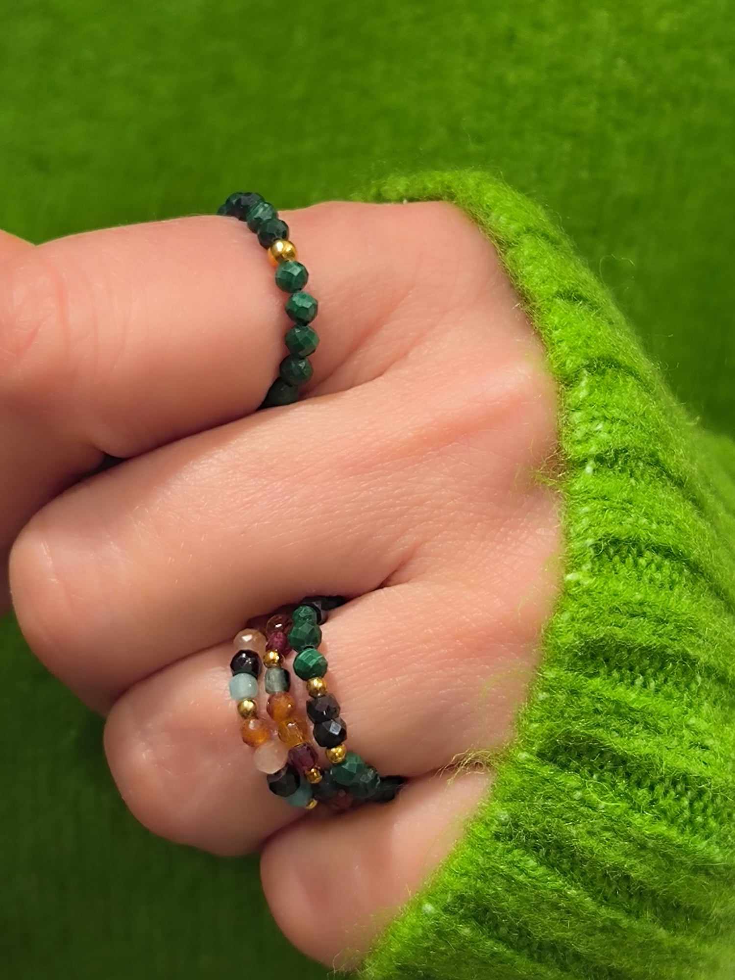 PE101 Pierscionek elastyczny z malachitów i ze srebra pozłacanego 24K