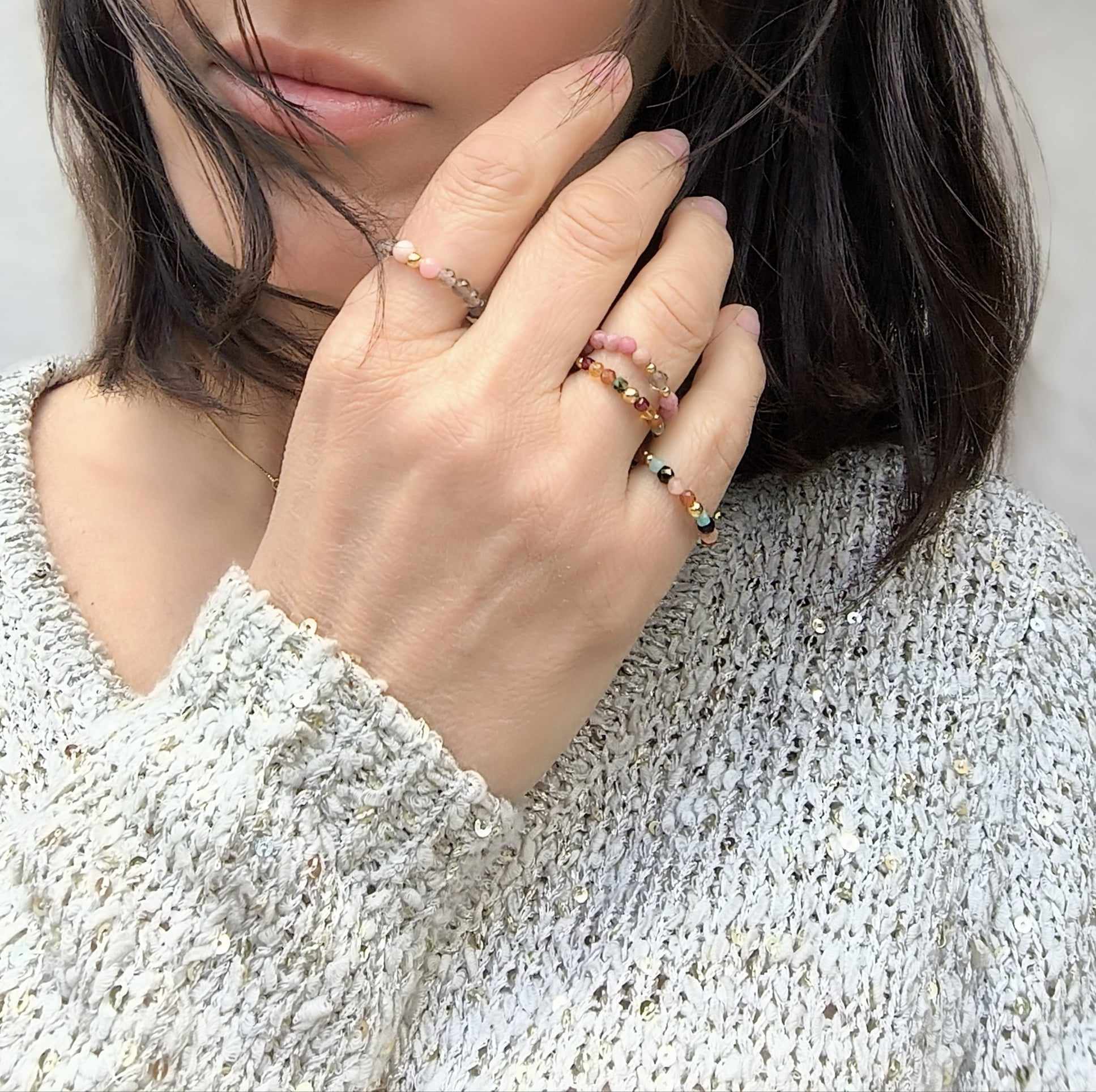 PE102 Pierścionek elastyczny z rodonitów, z kwarcem dymnym i srebrem pozłacanym 24K