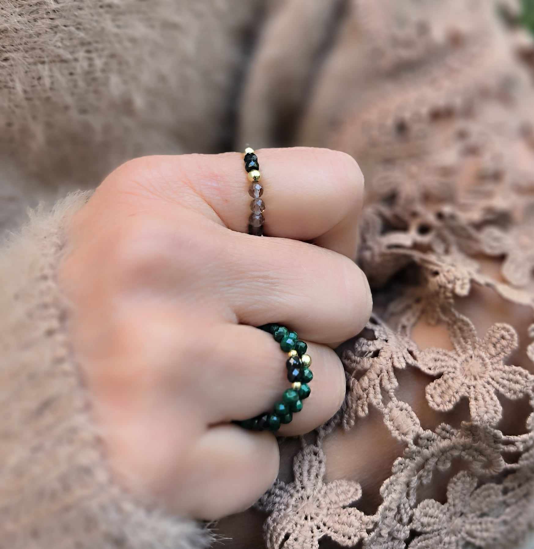 PE104 Pierścionek elastyczny z malachitów, cyrkonii i srebra pozłacanego 24K