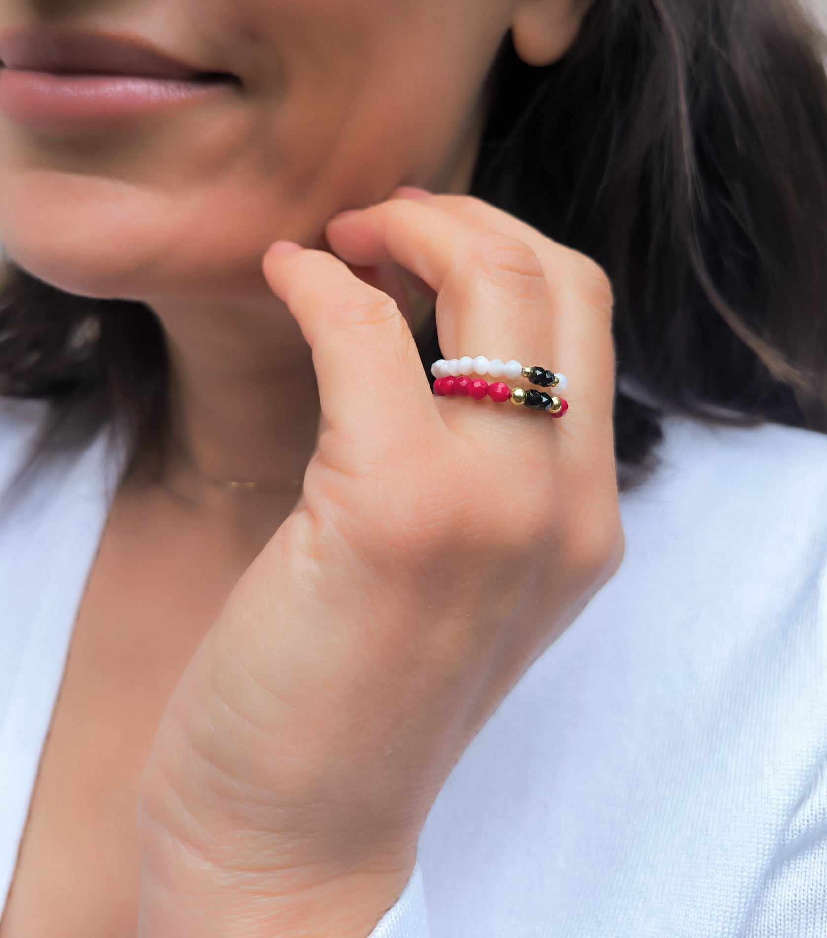 PE109 Pierścionek elastyczny z korala, cyrkonii i srebra pozłacanego 24K