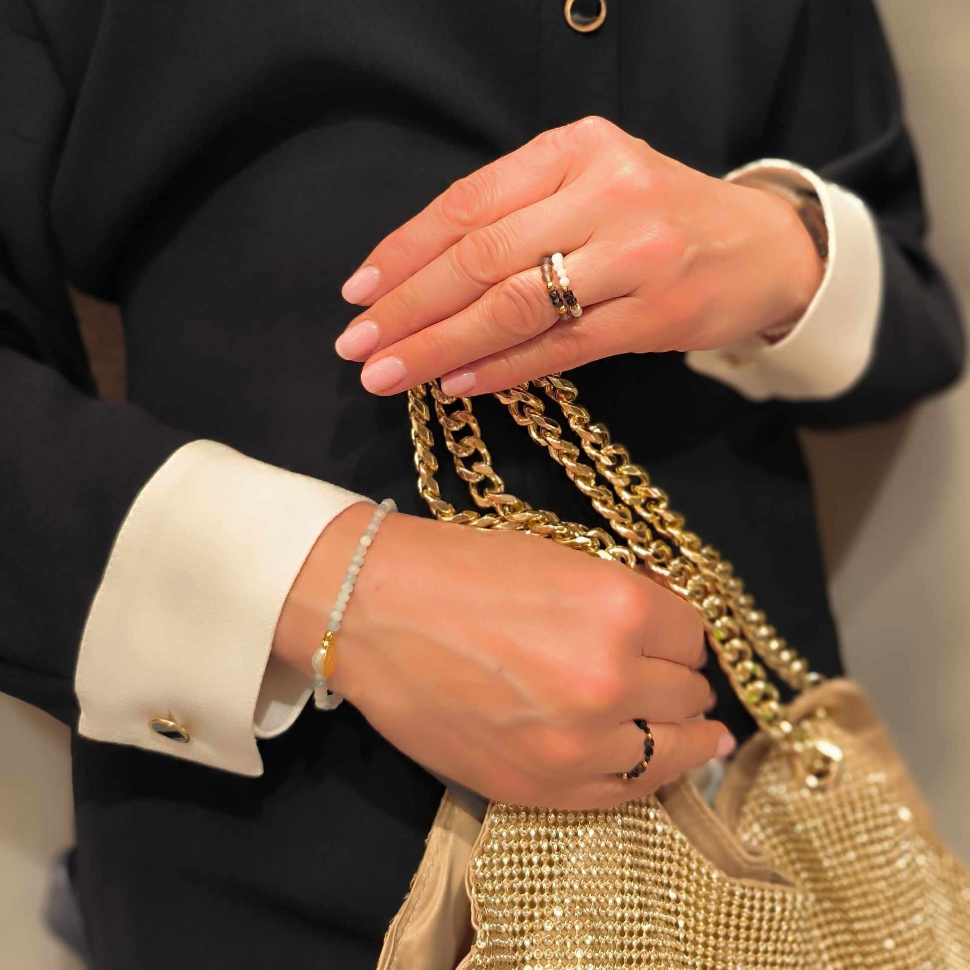 PE110 Pierścionek elastyczny z masy perłowej, cyrkonii i srebra pozłacanego 24K