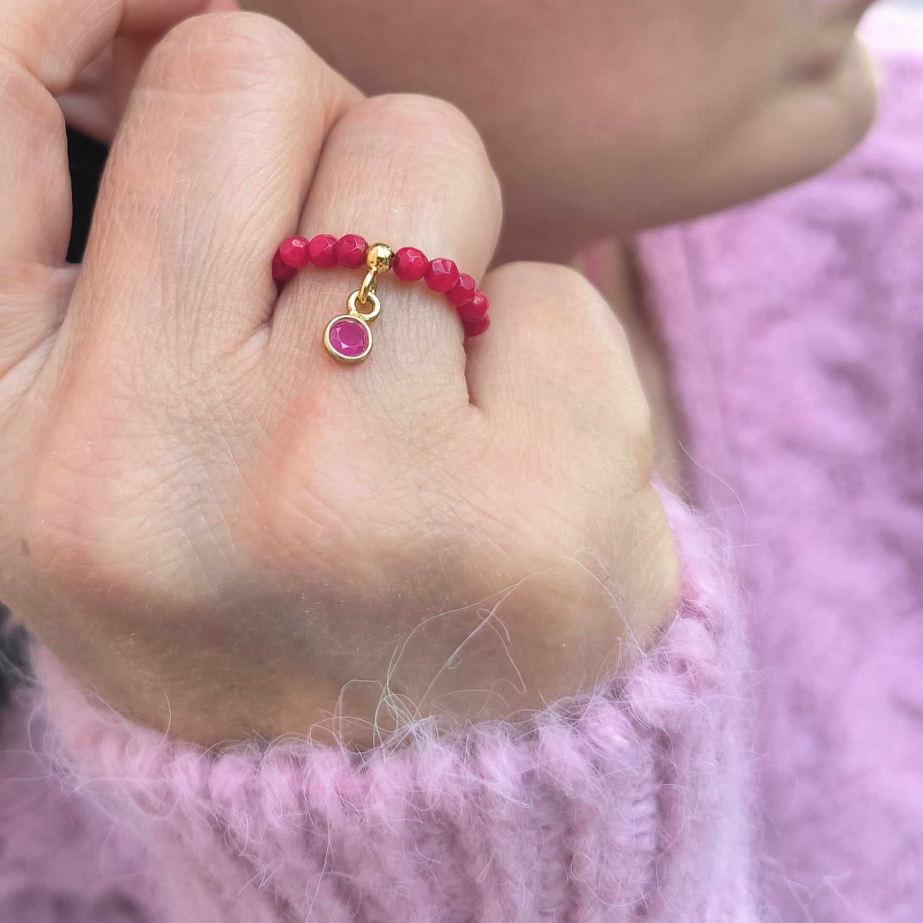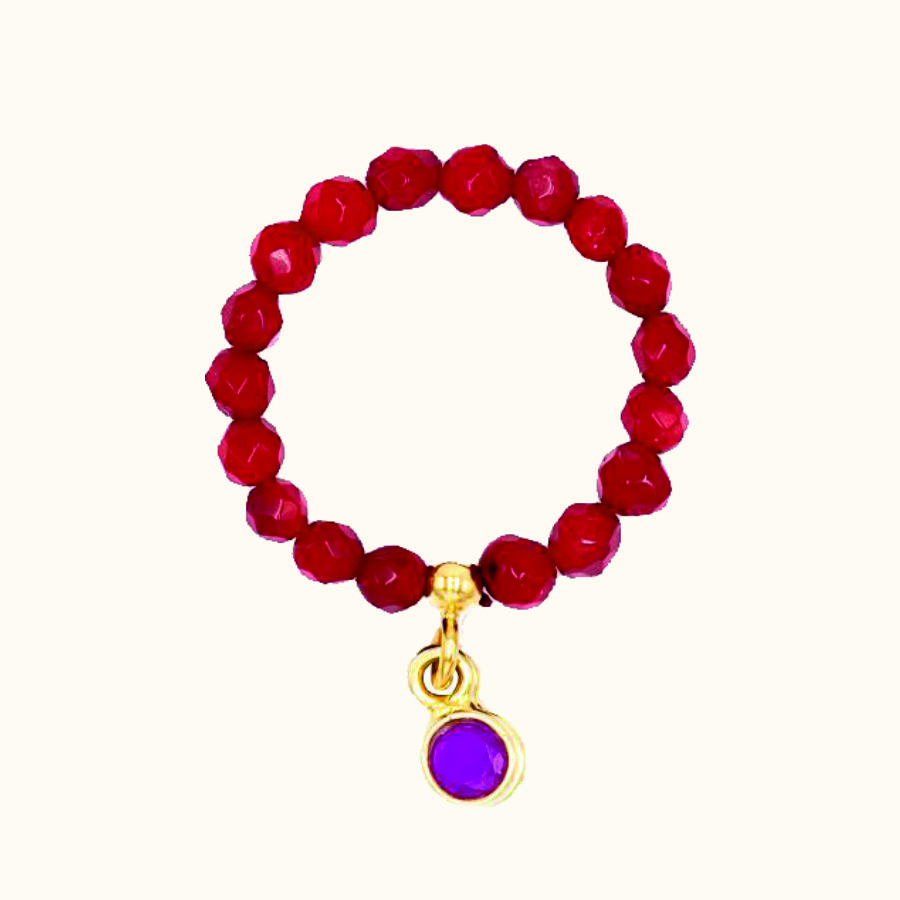 PE44 Pierścionek elastyczny z korala i z rubinem w okuciu ze srebra pozłacanego 24K