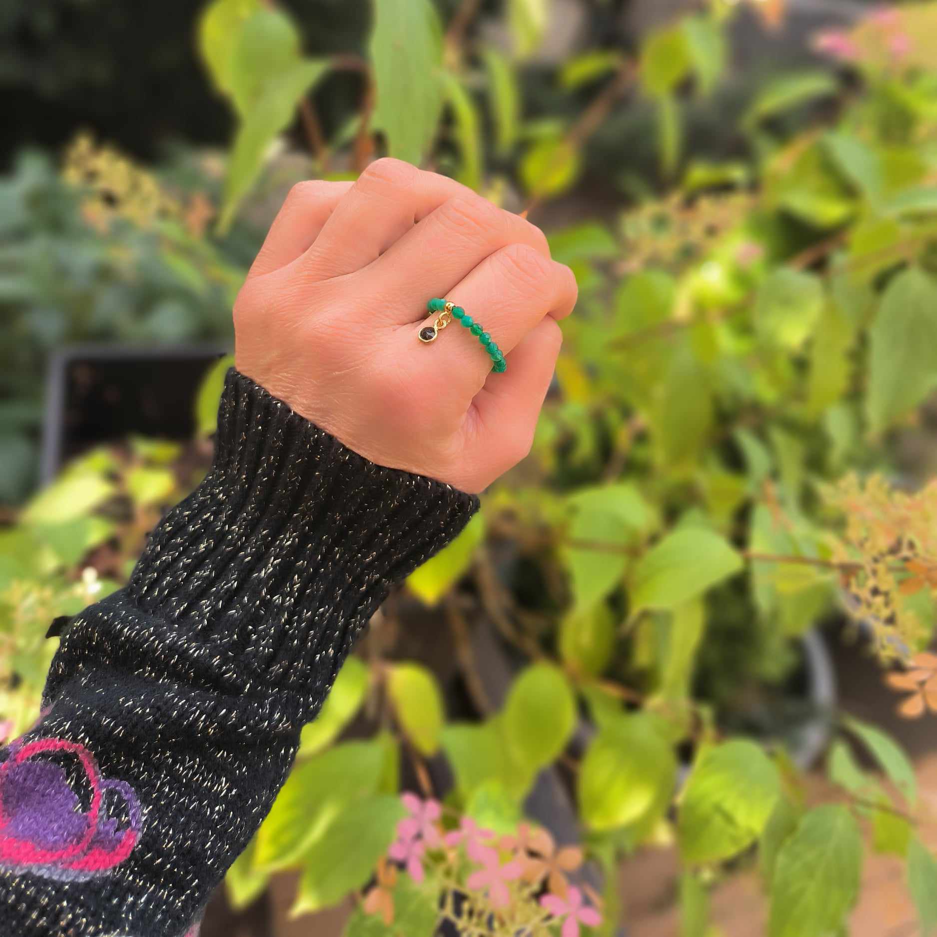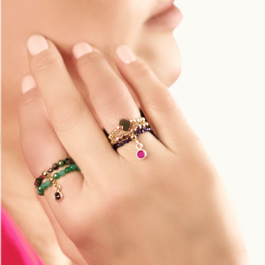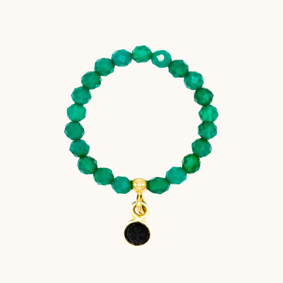 PE46 Pierścionek elastyczny z agatów i onyksu w okuciu ze srebra pozłacanego 24K