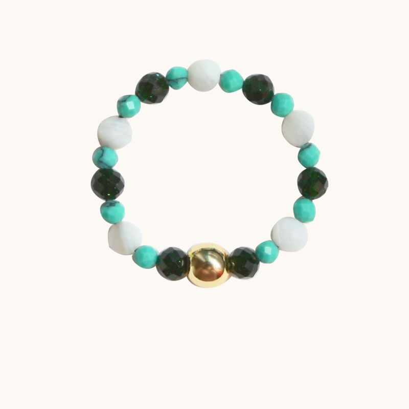 PE53 Pierścionek elastyczny z magnezytów, agatów oraz srebra pozłacanego 24K