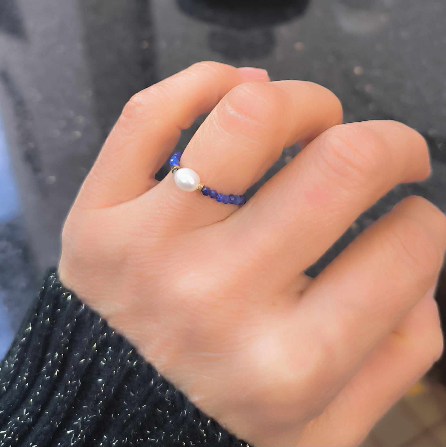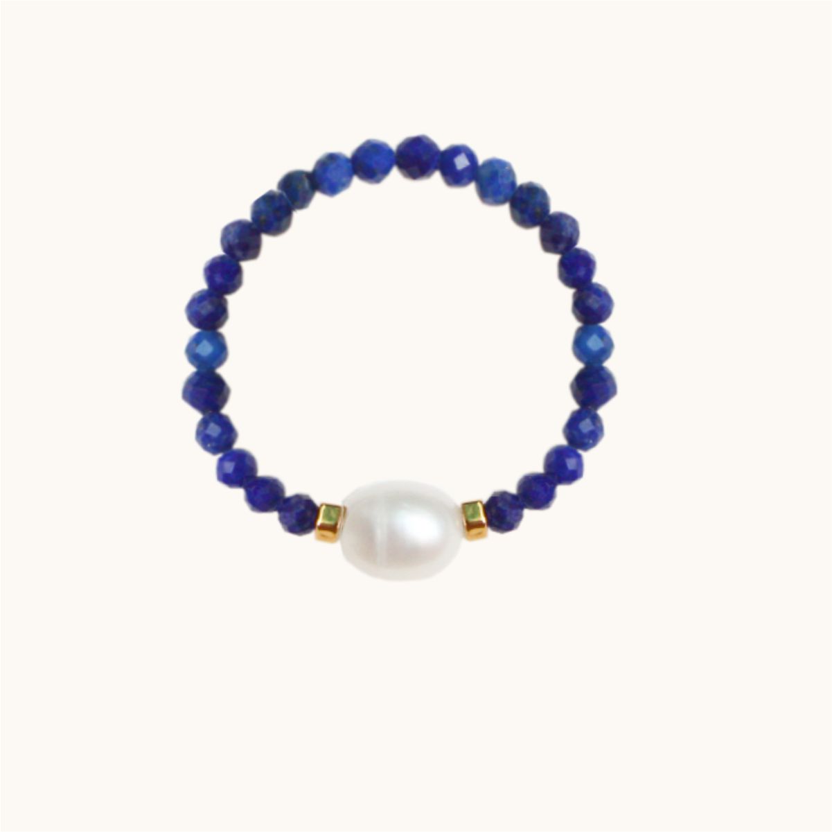 PE56 Pierścionek elastyczny z lapis lazuli oraz z perłą i srebrem pozłacanym 24K