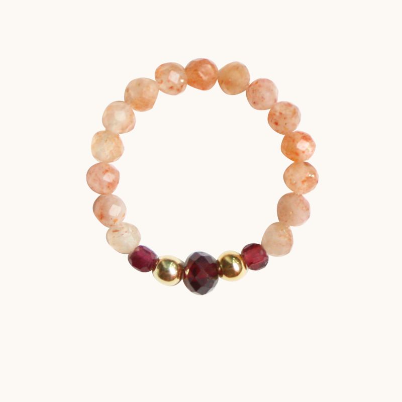PE58 Pierścionek elastyczny z kamienia słonecznego, granatów i srebra pozłacanego 24K