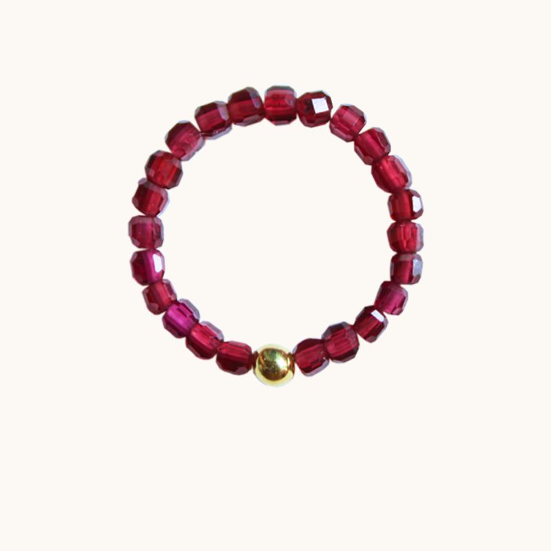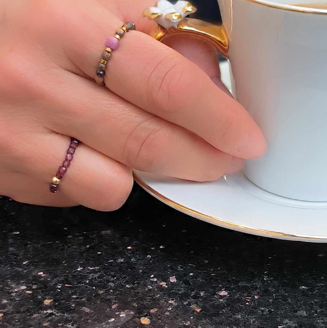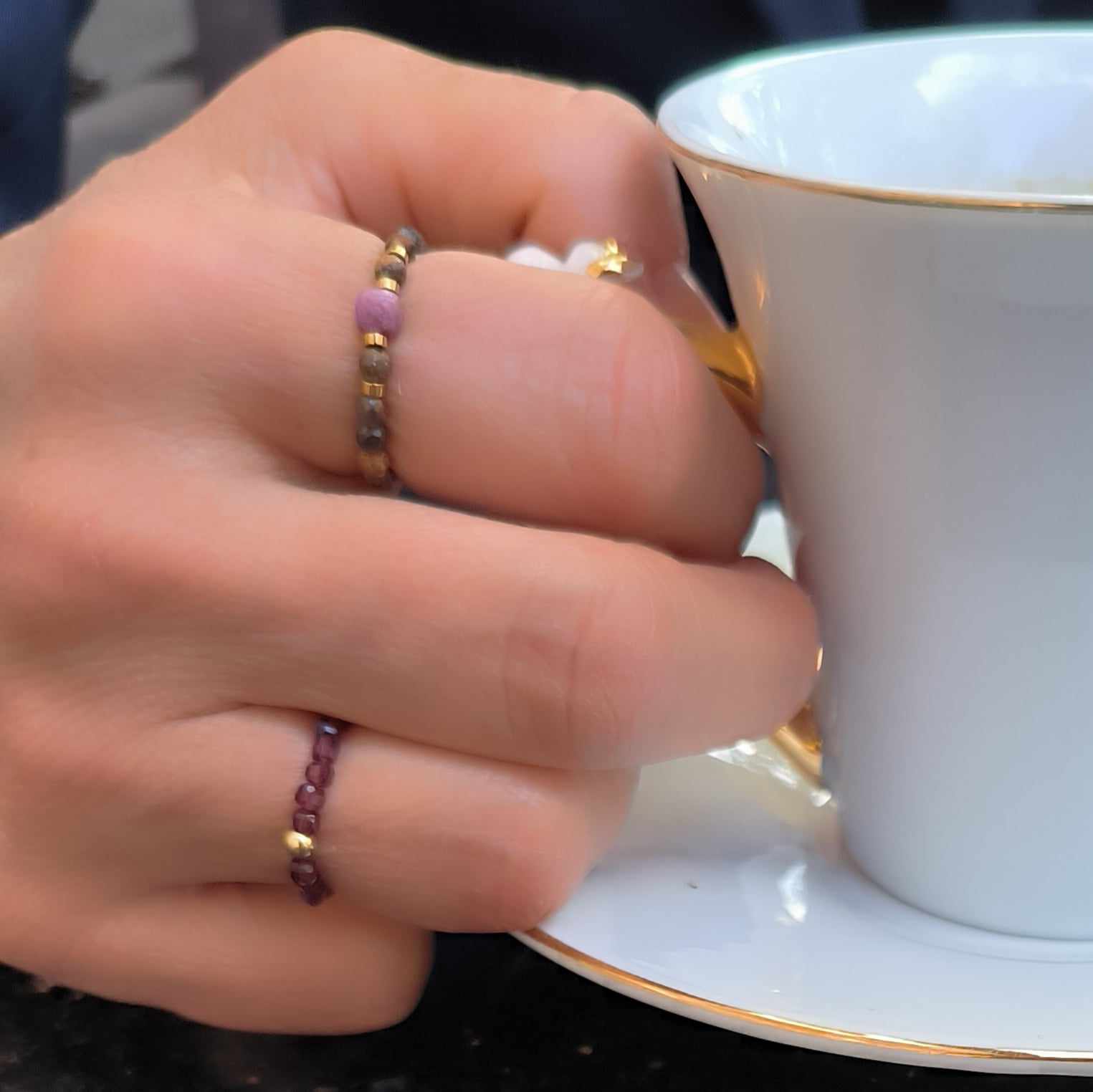 PE63 Pierścionek elastyczny z granatów oraz ze srebra pozłacanego 24K