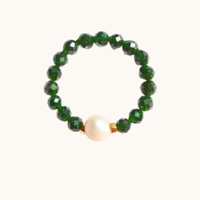 PE72 Pierścionek elastyczny z malachitów oraz z perłą i srebrem pozłacanym 24K