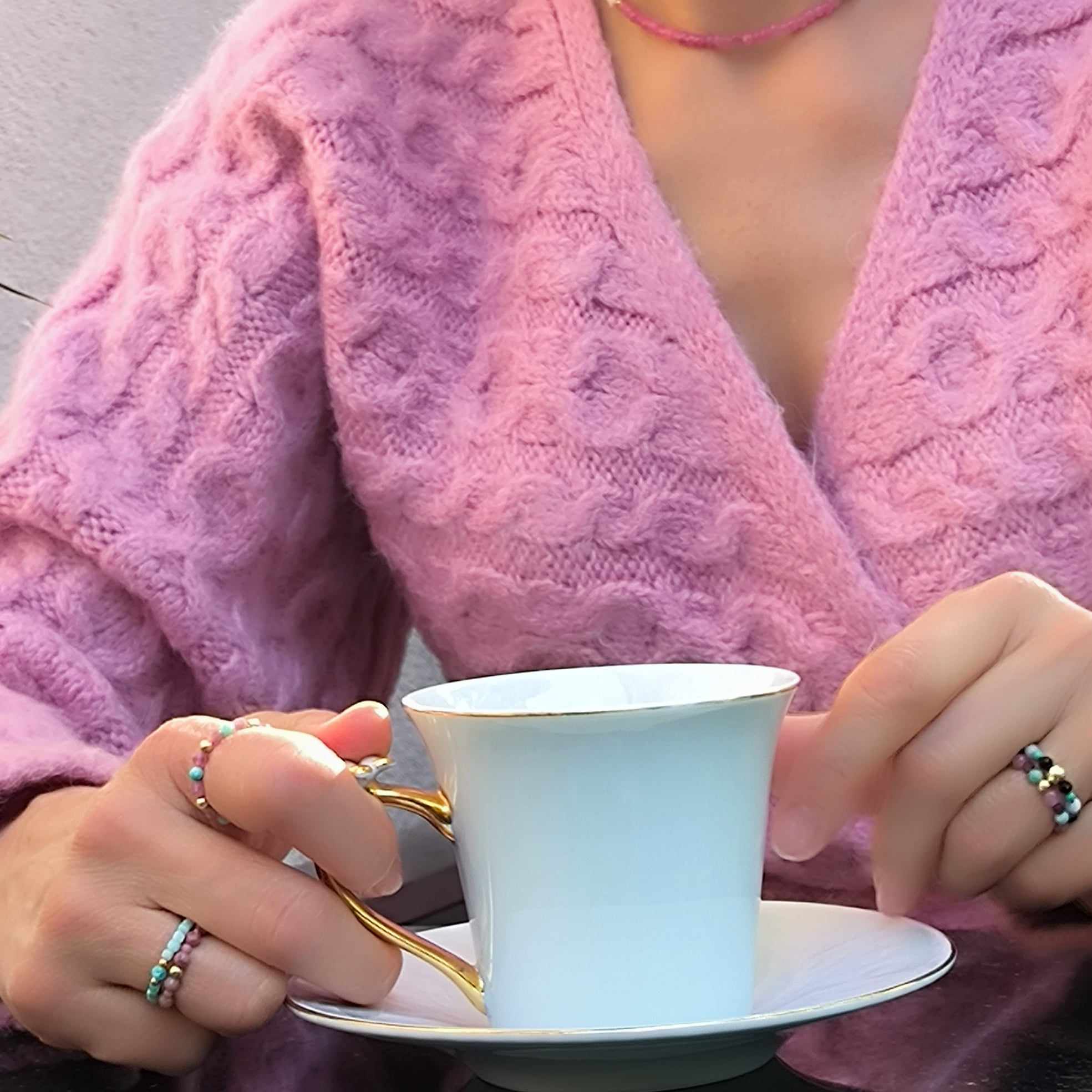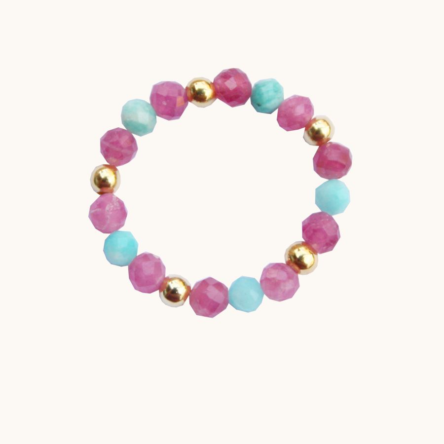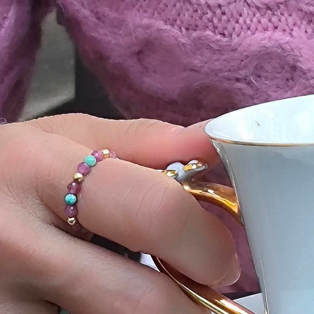 PE86 Pierścionek elastyczny z amazonitów i turamalinow oraz srebra pozłacanego 24K