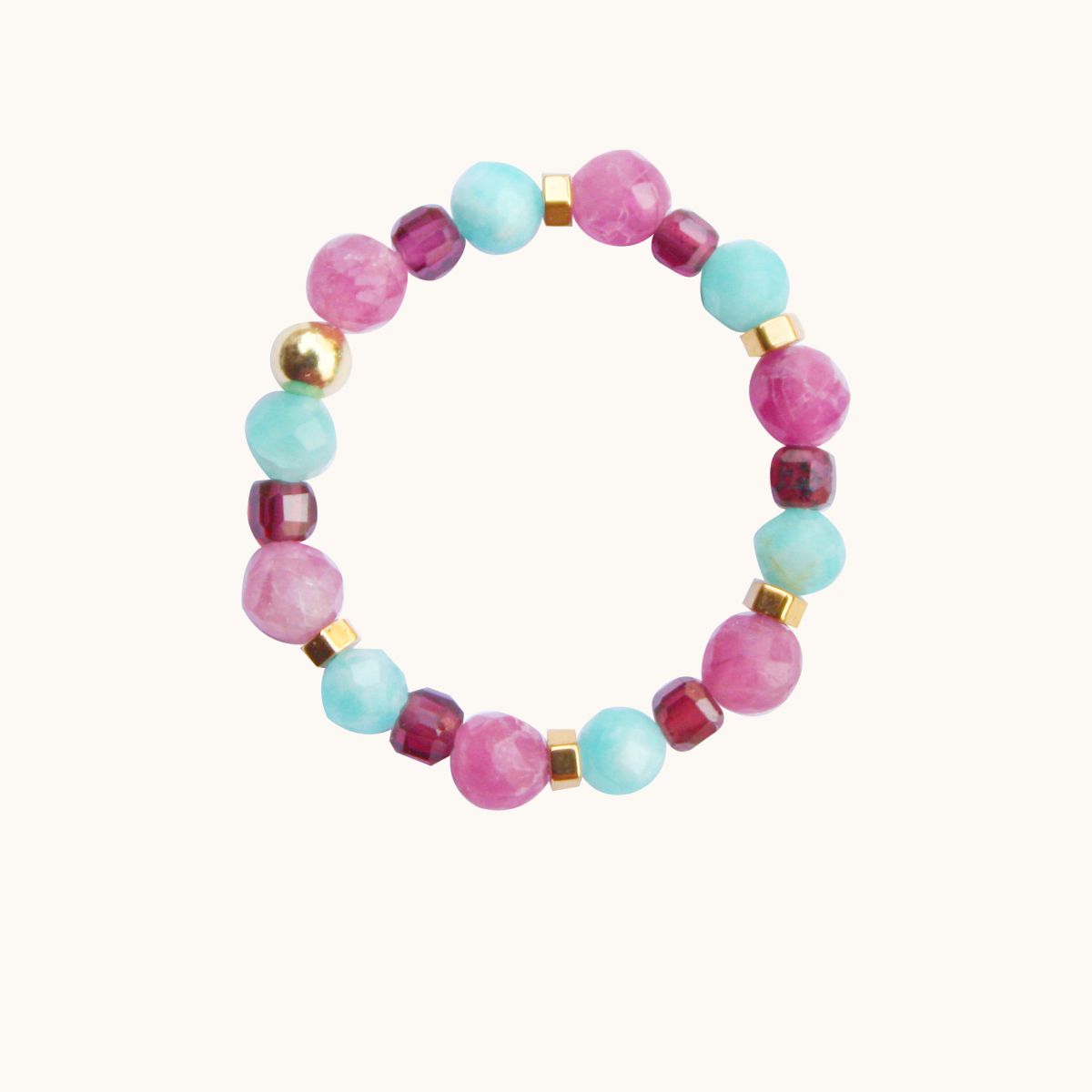 PE88 Pierścionek elastyczny z turmalinów, amazonitów i granatów oraz srebra pozłacanego 24K