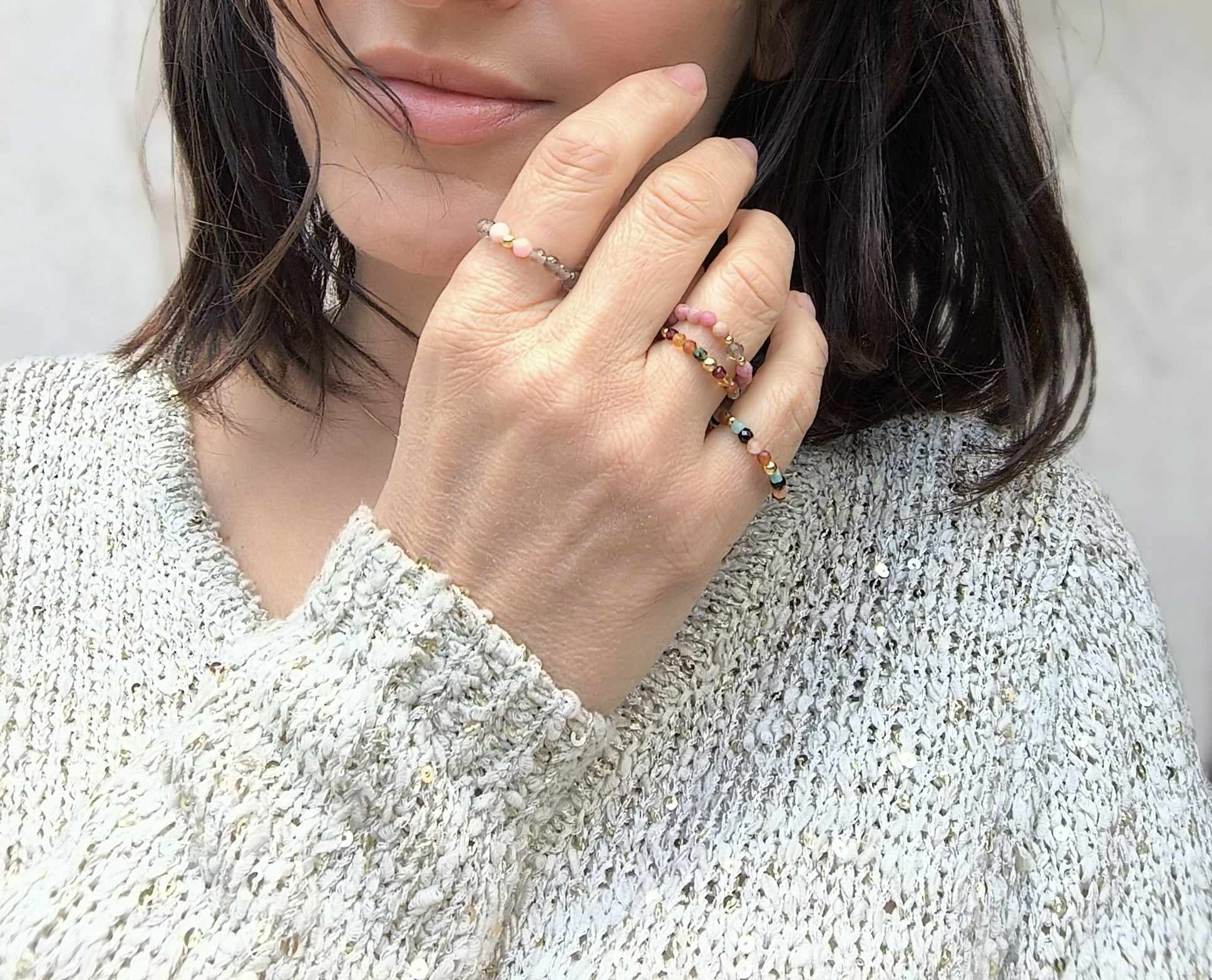 PE98 Pierścionek elastyczny z kwarcu dymnego i opali oraz srebra pozłacanego 24K